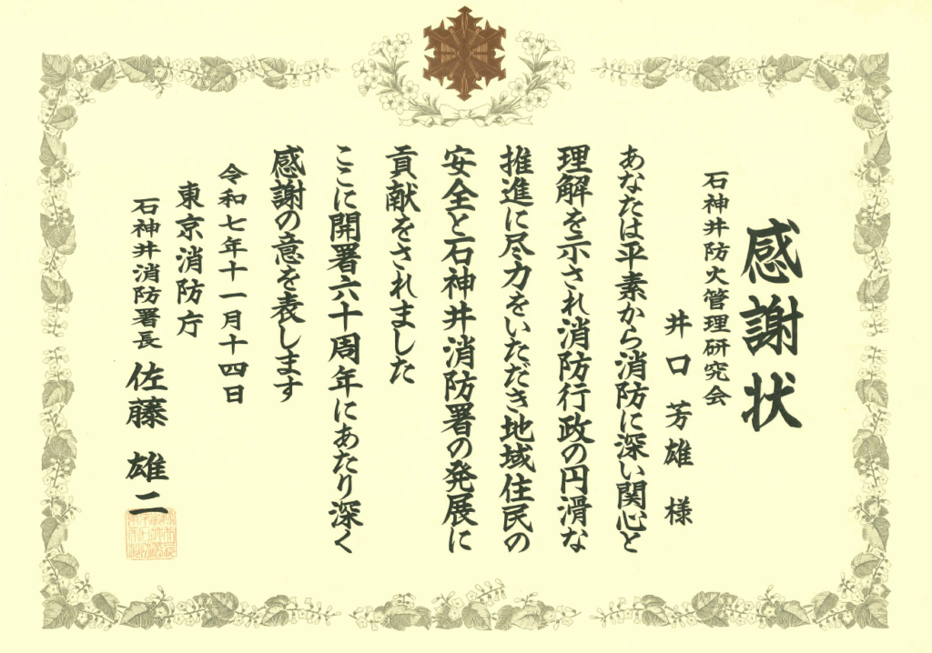この度、石神井消防署開署60周年記念式典において火災予防業務協力者等表彰式が行われ、石神井防火管理研究会に属する当社代表の井口へ感謝状が贈られました。